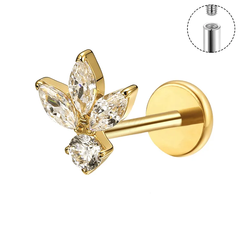 The Daweys DS4426 lip stud combines elegance with safety, designed for those who love a refined and stylish piercing look. Made from ASTM F136 implant-grade titanium, this internally threaded labret ensures a smooth, irritation-free piercing experience while being hypoallergenic and safe for sensitive skin. Its brilliant flower-shaped cubic zirconia cluster set in a gold-tone finish adds a touch of glamour, making it ideal for both everyday wear and special occasions.