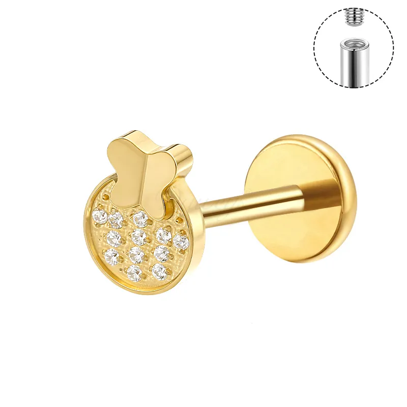 Achieve a clean, stylish look with the Daweys DS4454 Bone Top Lip Stud, crafted from solid ASTM F136 titanium for superior safety and durability. Designed with a cute bone-shaped top and a crystal-studded disc, this piece features mirror polishing and 18K gold PVD coating for a luxurious shine. Available in 1.2mm thickness with lengths 6mm, 8milímetros, 10milímetros, and 12mm.